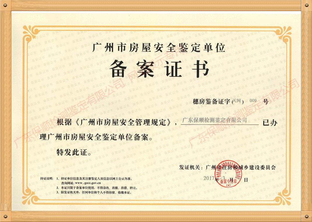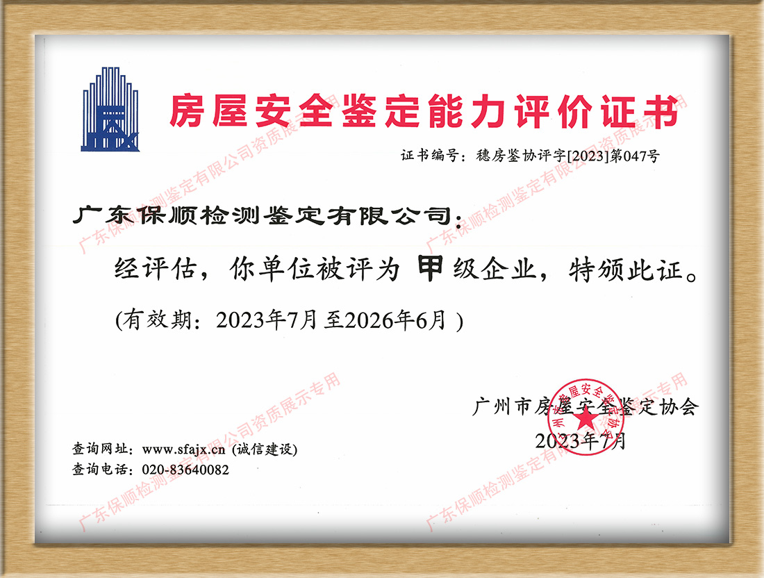 廣東保順檢測鑒定有限公司創(chuàng)辦于2004年,具有建設(shè)工程質(zhì)量檢測機(jī)構(gòu)資質(zhì)、國家CMA/CNAS認(rèn)可資質(zhì),以及住建委房屋檢測鑒定資質(zhì)備案的甲級房屋鑒定機(jī)構(gòu),已通過ISO9001質(zhì)量管理體系及高新技術(shù)企業(yè)認(rèn)證。已入廣東、廣西、海南、湖南、湖北、四川、貴州、云南等省高級人民法院及各地區(qū)中院房屋鑒定機(jī)構(gòu)名冊,受理各類司法仲裁糾紛案例8000余宗。?