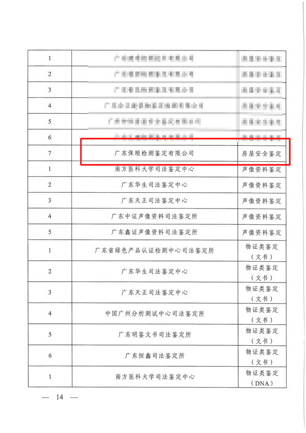 根據(jù)《廣東省高級人民法院關(guān)于印發(fā)<廣東法院2018年度司法委托專業(yè)機構(gòu)增補名冊>的通知》(粵高法[2018]223號),廣東保順檢測鑒定有限公司入選廣州市中級人民法院司法鑒定機構(gòu)名冊。代碼(搖珠號)為7,鑒定類別為:房屋安全鑒定。
